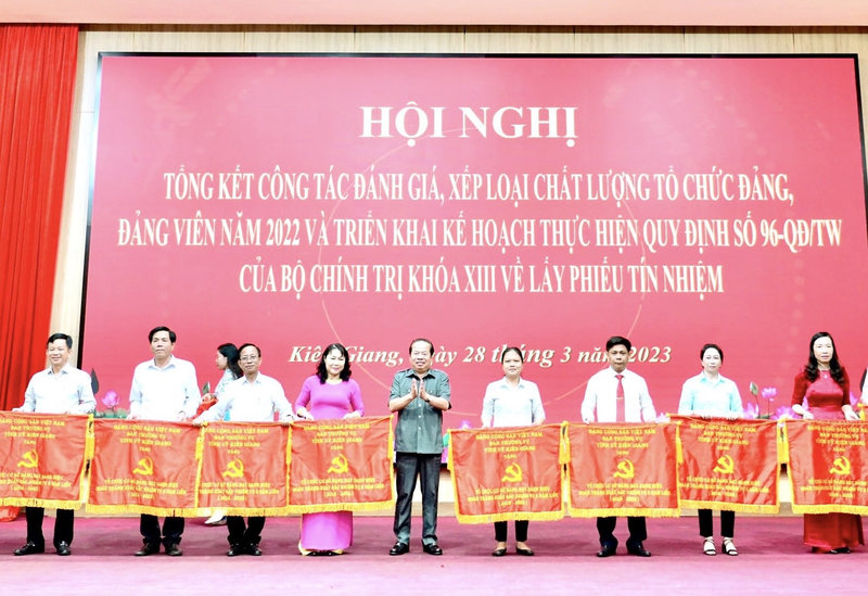 Đồng chí Mai Văn Huỳnh, Phó Bí thư Thường trực Tỉnh ủy, Chủ tịch Hội đồng nhân dân tỉnh Kiên Giang, tặng cờ cho các tổ chức cơ sở đảng đạt danh hiệu hoàn thành xuất sắc nhiệm vụ 5 năm liền (2018-2022).