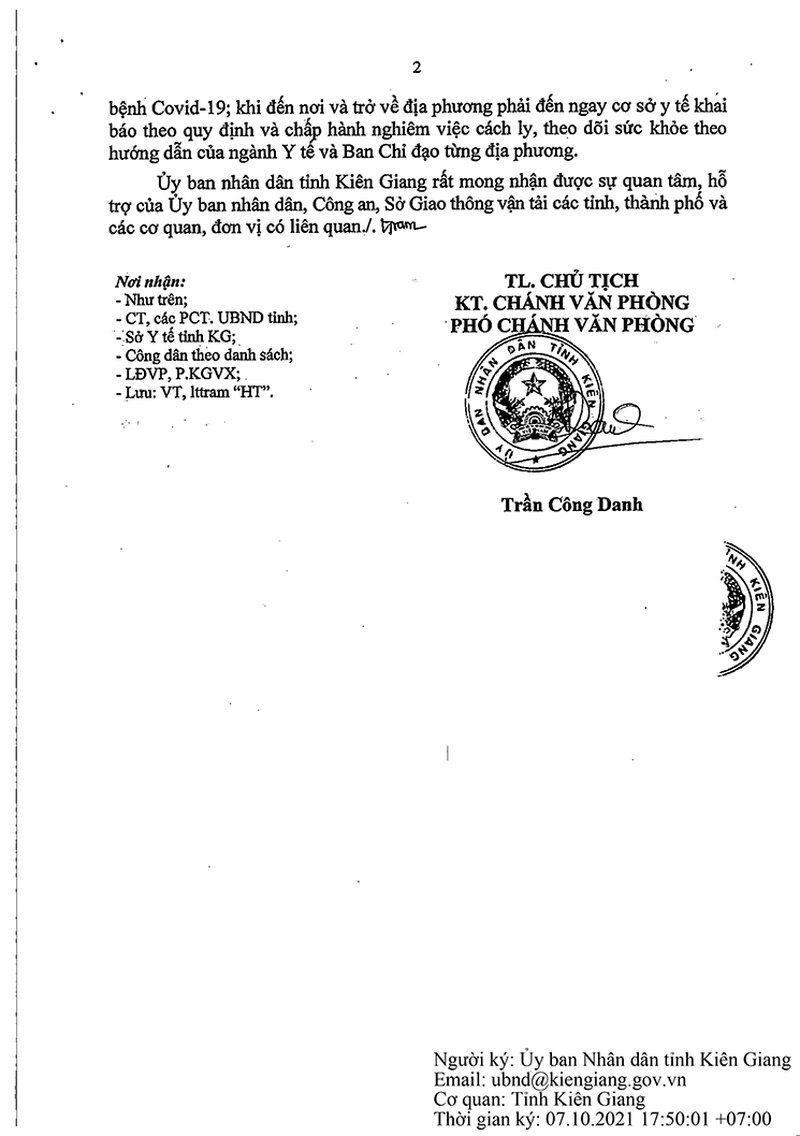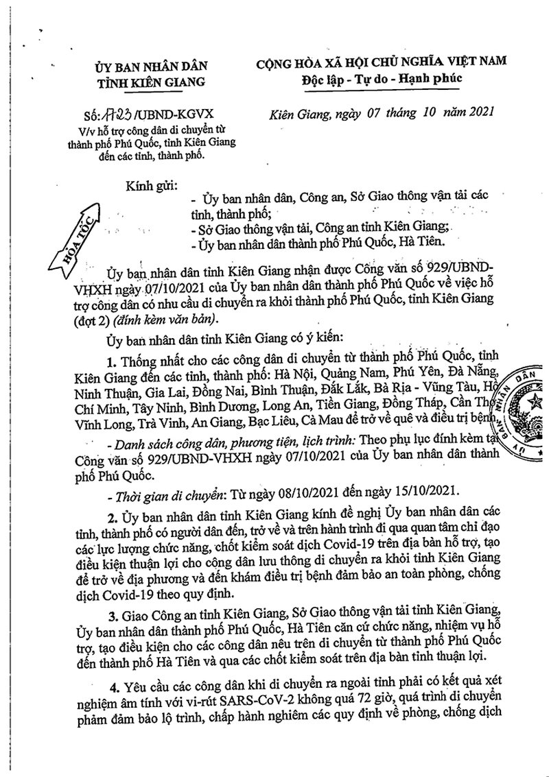 Công văn và danh sách hỗ trợ công dân di chuyển từ thành phố Phú Quốc, tỉnh Kiên Giang đến các tỉnh, thành phố đợt 2.