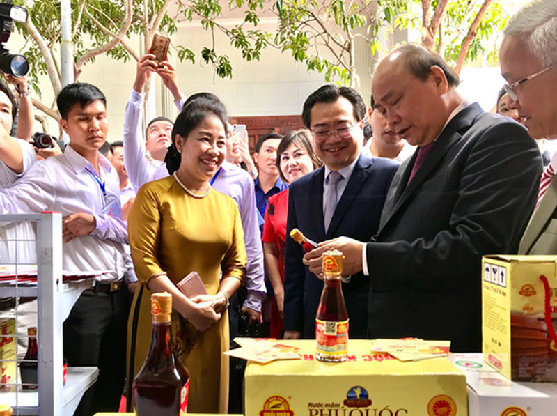 Thủ tướng Nguyễn Xuân Phúc tham quan khu trưng bày sản phẩm đặc trưng của tỉnh - Ảnh: Đình Tuyển