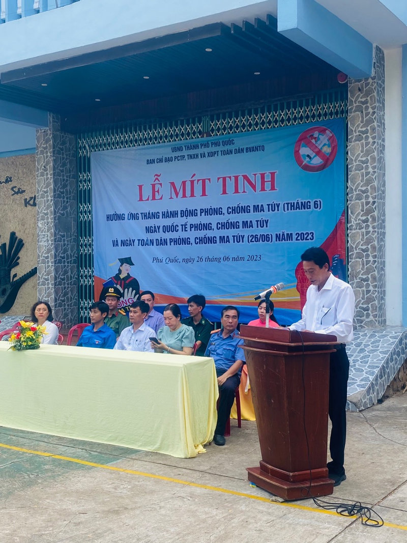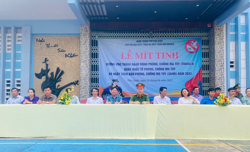 Sáng ngày 26/6/2023, Ban Chỉ đạo phòng, chống tội phạm, tệ nạn xã hội và xây dựng phong trào toàn dân bảo vệ an ninh Tổ quốc thành phố Phú Quốc tổ chức Lễ Mít tinh, Diễu hành hưởng ứng “Tháng hành động phòng, chống ma túy”, “Ngày quốc tế phòng, chống ma túy” và “Ngày toàn dân phòng, chống ma túy” năm 2023. Tham dự có các đồng chí: Phạm Văn Nghiệp - Ủy viên Ban Thường vụ Thành uỷ, Phó Chủ tịch UBND thành phố; Thượng tá Mai Phương Nam - Ủy viên Ban Thường vụ Thành uỷ, Trưởng Công an thành phố, Phó Trưởng Ban thường trực Ban Chỉ đạo thành phố. Đến dự buổi Lễ còn có sự tham dự của hơn 200 cán bộ, chiến sỹ lực lượng Công an, Quân đội và UBND các xã, phường, các cơ quan, ban, ngành, đoàn thể, đoàn viên thanh niên trên địa bàn thành phố.