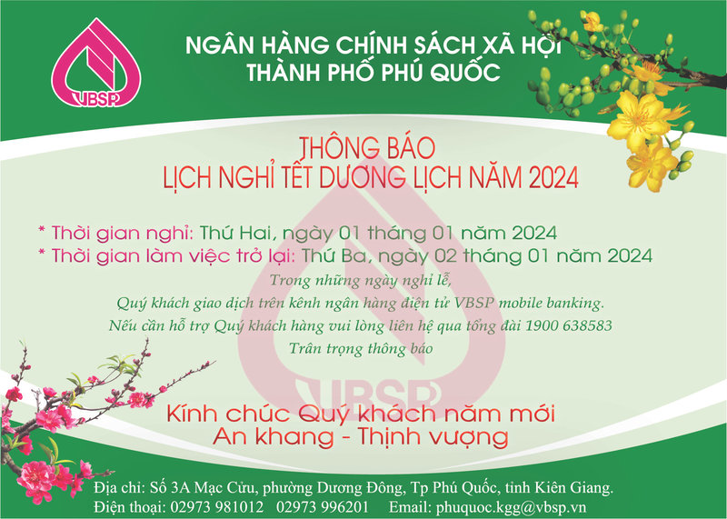aA Thông báo Ngân hàng chính sách xã hội thành phố Phú Quốc thông báo lịch nghỉ tết dương lịch năm 2024 26/12/2023, 08:24 Quay về Chia sẻ Z Copy link thành công Tin khác Thông báo các hình thức tiếp nhận thông tin vụ việc dân sự công ích nhằm phục vụ công tác thí điểm VKSND khởi kiện vụ án dân sự để bảo vệ lợi ích công Thông báo 06/02/2026 Thông báo về việc niêm yết công khai dự thảo Báo cáo đánh giá tác động môi trường của dự án Nhà máy nước Hồ Cửa Cạn Quy hoạch - Phát triển Thông báo 06/02/2026 Thông báo Về việc niêm yết công khai danh sách cử trị tham gia bầu cử đại biểu Quốc hội khóa XVI và đại biểu Hội đồng nhân dân các cấp nhiệm kỳ 2026 - 2031 trên địa bàn đặc khu Phú Quốc Hoạt động của Đảng - Đoàn thể Thông báo 03/02/2026 Chương trình cho vay học ngành Stem dành cho học sinh, sinh viên, học viên thạc sĩ, nghiên cứu sinh. Thông báo 03/09/2025 Bản tin đột xuất nhận định mưa lũ trên lưu vực sông Mê Công và vùng ĐBSCL do ảnh hưởng của cơn bão số 5 - (25/08/2025) Thông báo 26/08/2025 Tin bão Khẩn cấp(Cơn bão số 5) Thông báo 26/08/2025 Tin cuối cùng về cơn bão số 5 Thông báo 26/08/2025 Về việc treo Quốc kỳ và nghỉ Lễ Giỗ Tổ Hùng Vương, Lễ kỷ niệm 50 năm ngày Giải phóng hoàn toàn miền Nam, thống nhất đất nước (30/4/1975 - 30/4/2025) Thông báo 30/03/2025 Thông báo Chương trình cho vay nhà ở xã hội ngân hàng chính sách xã hội chi nhánh Kiên Giang Thông báo 27/03/2025 Về việc Kết luận thanh tra việc thực hiện các quy định pháp luật về quản lý, sử dụng tài chính ngân sách và quản lý xây dựng cơ bản tại UBND xã Cửa Cạn Thông báo 27/02/2025 /ngan-hang-chinh-sach-xa-hoi-thanh-pho-phu-quoc-thong-bao-lich-nghi-tet-duong-lich-nam-2024