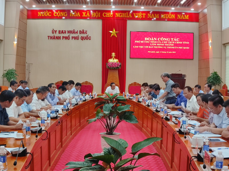Phát biểu tại buổi làm việc, PBT Tỉnh uỷ, Chủ tịch UBND tỉnh Kiên Giang đánh giá cao, sự nổ lực, quyết tâm cao BTV Thành uỷ, UBND thành phố trong thực hiện nhiệm vụ. Tuy nhiên, bên cạnh những kết quả đạt được vẫn còn một số lĩnh vực còn chậm như: giá trị công nghiệp xây dựng, vốn đầu tư toàn xã hội, giải ngân đầu tư công, công tác bồi hoàn tái định cự, xây dựng nông thôn mới, tình hình tội phạm, tệ nạn xã hội, tai nạn giao thông vẫn còn ở mức cao, tranh chấp, khiếu kiện đất đai còn nhiều, dịch vụ du lịch giảm…Trong thời gian tới, PBT Tỉnh uỷ, chủ tịch UBND tỉnh ông Lâm Minh Thành chỉ đạo thành phố Phú Quốc tiếp tục tổ chức lại bộ máy nhất là cán bộ, lãnh đạo. Rà soát, công tác quy hoạch, bổ sung quy hoạch. Đẩy mạnh, quan tâm hơn nữa công tác vận động nhân dân chấp hành tốt văn minh đô thị, dịch vụ du lịch.