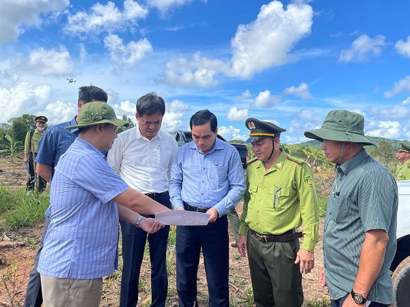 Phó Chủ tịch UBND tỉnh Lê Quốc Anh (thứ hai, từ trái qua) kiểm tra thực địa các khu vực rừng bị lấn, chiếm và phá rừng trái pháp luật.