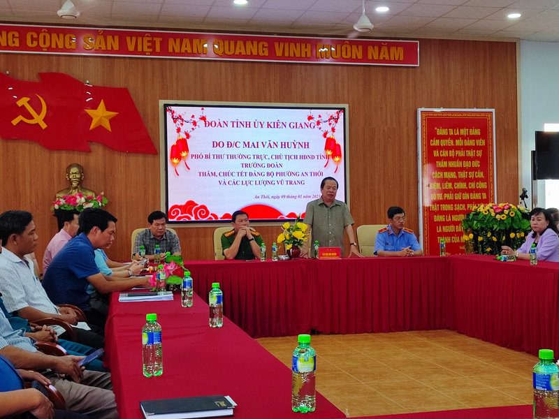 Phó Bí thư thường trực Tỉnh ủy Mai Văn Huỳnh (đứng), phát biểu chúc mừng năm mới Đảng ủy phường An Thới thành phố Phú Quốc.