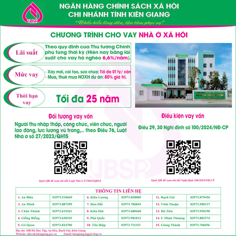 aA Thông báo Thông báo Chương trình cho vay nhà ở xã hội ngân hàng chính sách xã hội chi nhánh Kiên Giang 27/03/2025, 15:58 Thông báo Chương trình cho vay nhà ở xã hội ngân hàng chính sách xã hội chi nhánh Kiên Giang Quay về Chia sẻ Z Copy link thành công Tin khác Thông báo các hình thức tiếp nhận thông tin vụ việc dân sự công ích nhằm phục vụ công tác thí điểm VKSND khởi kiện vụ án dân sự để bảo vệ lợi ích công Thông báo 06/02/2026 Thông báo về việc niêm yết công khai dự thảo Báo cáo đánh giá tác động môi trường của dự án Nhà máy nước Hồ Cửa Cạn Quy hoạch - Phát triển Thông báo 06/02/2026 Thông báo Về việc niêm yết công khai danh sách cử trị tham gia bầu cử đại biểu Quốc hội khóa XVI và đại biểu Hội đồng nhân dân các cấp nhiệm kỳ 2026 - 2031 trên địa bàn đặc khu Phú Quốc Hoạt động của Đảng - Đoàn thể Thông báo 03/02/2026 Chương trình cho vay học ngành Stem dành cho học sinh, sinh viên, học viên thạc sĩ, nghiên cứu sinh. Thông báo 03/09/2025 Bản tin đột xuất nhận định mưa lũ trên lưu vực sông Mê Công và vùng ĐBSCL do ảnh hưởng của cơn bão số 5 - (25/08/2025) Thông báo 26/08/2025 Tin bão Khẩn cấp(Cơn bão số 5) Thông báo 26/08/2025 Tin cuối cùng về cơn bão số 5 Thông báo 26/08/2025 Về việc treo Quốc kỳ và nghỉ Lễ Giỗ Tổ Hùng Vương, Lễ kỷ niệm 50 năm ngày Giải phóng hoàn toàn miền Nam, thống nhất đất nước (30/4/1975 - 30/4/2025) Thông báo 30/03/2025 Về việc Kết luận thanh tra việc thực hiện các quy định pháp luật về quản lý, sử dụng tài chính ngân sách và quản lý xây dựng cơ bản tại UBND xã Cửa Cạn Thông báo 27/02/2025 Về việc treo Quốc kỳ và nghỉ tết Nguyên đán Ất Tỵ năm 2025 Thông báo 31/12/2024 /thong-bao-chuong-trinh-cho-vay-nha-o-xa-hoi-ngan-hang-chinh-sach-xa-hoi-chi-nhanh-kien-giang