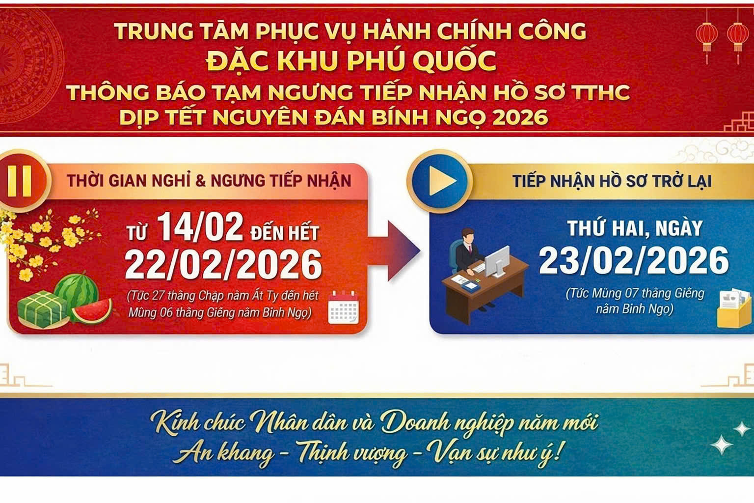 aA Thủ tục hành chính cấp xã Thông báo Thông báo tạm ngưng tiếp nhận hồ sơ TTHC dịp Tết Nguyên đán Bính Ngọ 2026 16/02/2026, 23:14 Quay về Chia sẻ Z Copy link thành công Tin khác /thong-bao-tam-ngung-tiep-nhan-ho-so-tthc-dip-tet-nguyen-dan-binh-ngo-2026