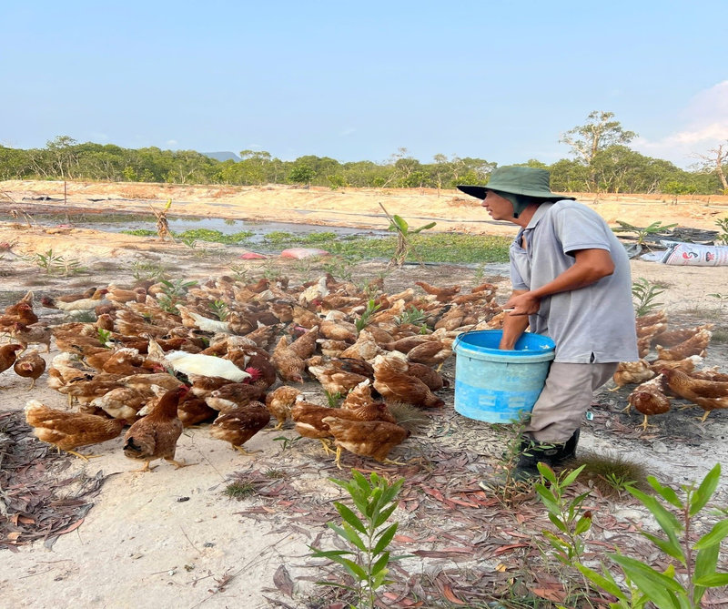 Anh Mai Công Đinh- chồng của chị Hoa đang cho đàn gà ăn.